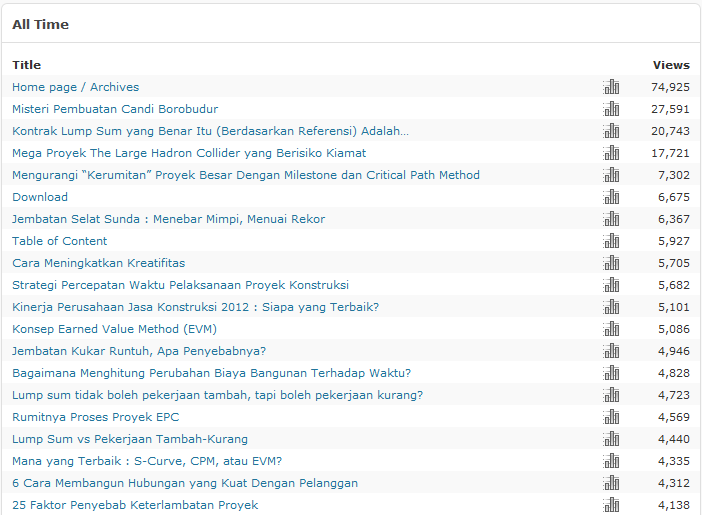 Dari judul posting yang paling banyak dilihat, ternyata masih dipegang oleh posting mengenai Misteri Pembuatan Candi Borobudur dengan viewer 79.925 viewer. Berikut Top 20 Post: