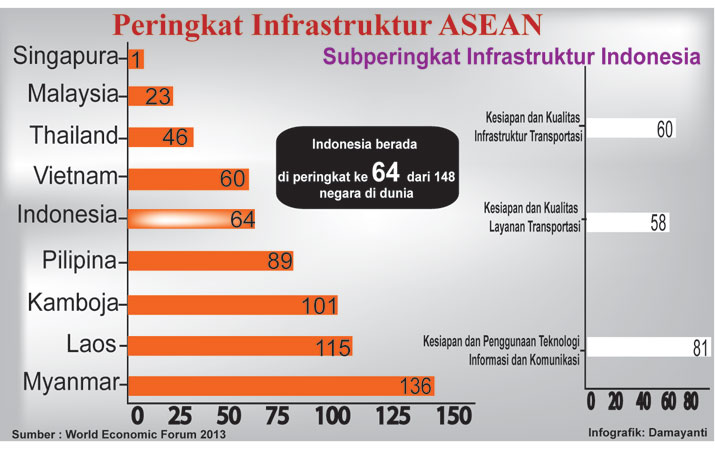 Sebagai negara yang berangan-angan ingin menjadi Macan Asia dalam hal ekonomi, Infrasruktur Indonesia berada dalam peringkat 64 dari 148 negara dan peringkat 5 dari 9 negara ASEAN. Indonesia bahkan sudah kalah dengan Thailand dan Vietnam. Indonesia seperti lelap tertidur ketika yang lain begitu aggresif. Dampaknya, hutang infrastruktur yang harus dibangun demi menggapai asa begitu banyaknya.