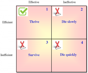 Gambar di atas menunjukkan bahwa adalah benar jika struktur organisasi harus EFEKTIF dan EFISIEN. Jika tidak, maka akan terjadi masalah seperti yang disebutkan pada zone 2-3-4 yaitu Die quickly, Survive, dan Die Slowly. THRIVE adalah tujuan yang benar bagi struktur organisasi. Referensi lain mengenai dilematika struktur organisasi ditunjukkan pada gambar di bawah ini :