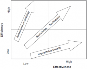 Pada gambar di atas, karakter organisasi proyek dibagi atas tiga. Ephemeral profitability (Keuntungan Sesaat) adalah kondisi bagi penganut paham condong efisien. Sedangkan Unprofitable Growth (Pertumbuhan yang tidak menguntungkan) adalah kondisi bagi penganut paham condong efektif. Ketiga adalah Sustainable Profitability (Keuntungan yang Terus Menerus) adalah TITIK OPTIMUM antara EFEKTIF dan EFISIEN yang merupakan tujuan yang benar dari suatu organisasi.