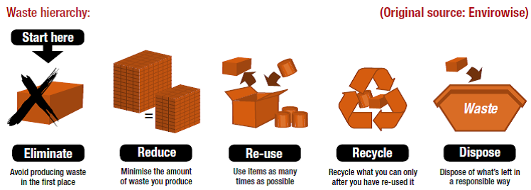 - Memaksimalkan penggunaan kembali waste material yang ada – Umumnya waste material konstruksi dapat digunakan kembali baik untuk pekerjaan utama maupun pekerjaan sementara. Penggunaan kembali akan secara signifikan menurunkan tingkat waste material. Contoh adalah penggunaan sisa besi tulangan untuk digunakan sebagai kolom praktis, keranjang material / sampah, penggunaan sisa kusen sebagai alat bantu jidar, penggunaan sisa pipa untuk tempat material kecil (paku, dll) atau pot tanaman penghijauan kantor proyek, dll