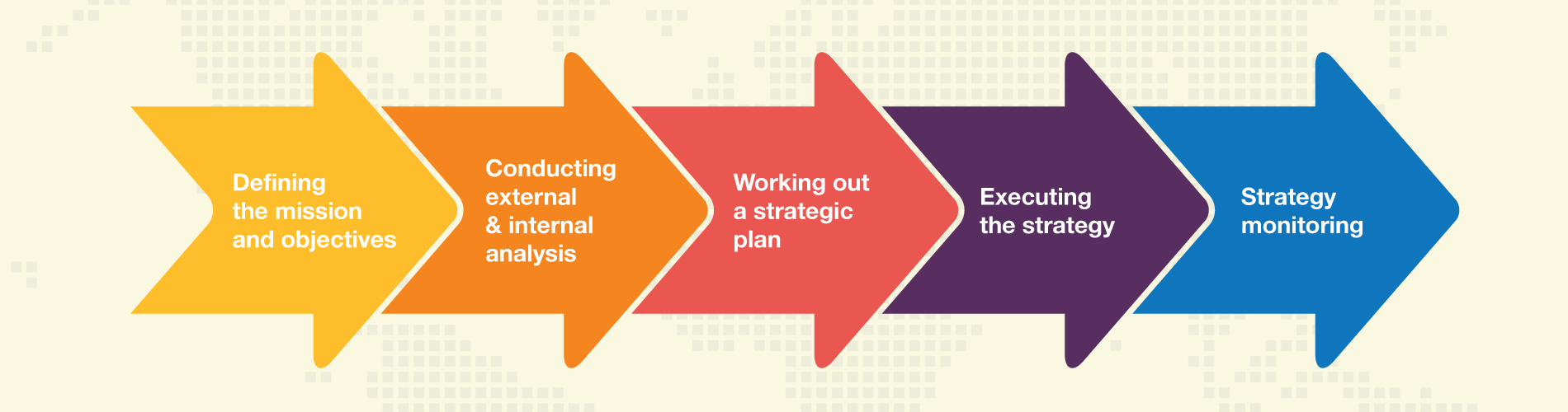 Berdasarkan model manajemen stratejik yang telah diberikan pada artikel sebelumnya, berikut ini adalah penjelasan singkat tiap langkah manajemen stratejik. Penjelasan akan disertai dengan informasi mengenai alat dan teknik yang sering digunakan pada tiap langkah.