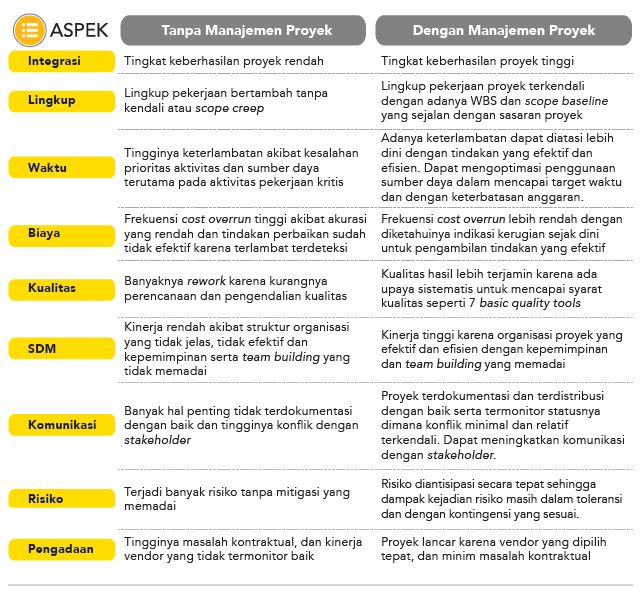 Untuk memahami manfaat manajemen proyek secara keseluruhan secara lebih mudah, berikut ini adalah perbandingan yang menunjukkan berbagai perbedaan kondisi proyek antara tanpa aplikasi manajemen proyek dan dengan aplikasi manajemen proyek pada semua aspek atau knowledge manajemen proyek seperti ditunjukkan pada Tabel di bawah