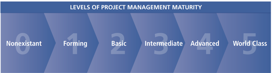 Beberapa lembaga internasional seperti PMI, PM Solution, Pricewaterhouse Coopers, termasuk para ahli telah mengembangkan beberapa model tingkat maturitas manajemen proyek. Namun dari semuanya dapat disimpulkan bahwa ada lima tahap pengembangan yang memiliki ciri khas atau syarat tertentu pada tiap tahap atau milestone yang dapat disimpulkan pada Gambar sebagai berikut :