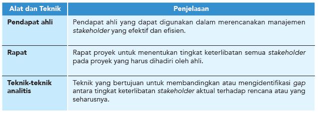 Alat dan teknik pendapat ahli dan rapat dalam manajemen stakeholder secara umum telah dijelaskan sebelumnya. Untuk teknik-teknik analitis, PMBOK 5th Edition memberikan contoh analisis perbedaan (gap analysis) atas tingkat keterlibatan Stakeholder saat ini secara aktual terhadap yang seharusnya dalam rangka mencapai tujuan proyek yang ditunjukkan pada Tabel 6.12. Dengan teridentifikasinya gap, maka akan dapat dilakukan rencana atau strategi khusus untuk mengatasi gap tersebut.
