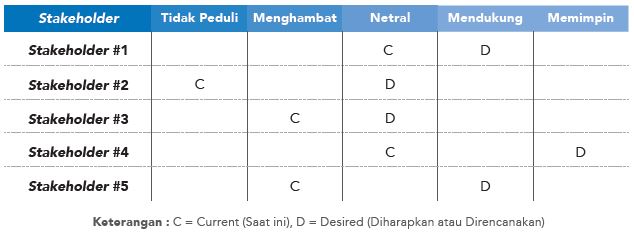 - Perbedaan tingkat keterlibatan stakeholder kunci antara aktual saat ini dan yang seharusnya.