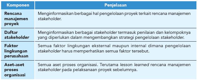 Terdapat beberapa masukan dalam melakukan proses ini berdasarkan standar PMBOK 5th Edition. Komponen beserta definisi atau rincian atau penjelasan terkait diberikan pada Tabel di bawah ini :