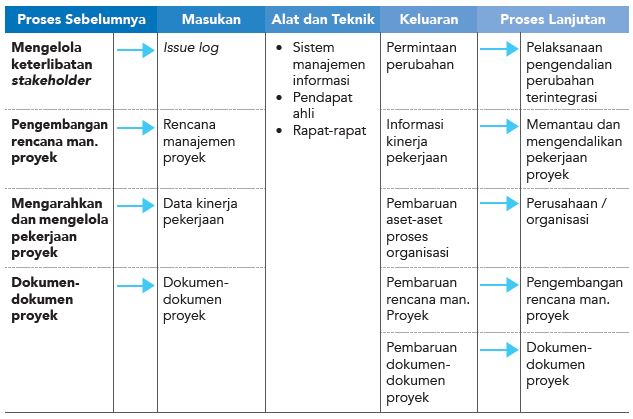 Proses ini dilakukan berdasarkan rencana manajemen proyek. Data dan informasi yang akan diproses berasal dari catatan isu (issue log) dan data kinerja pekerjaan serta dokumen-dokumen proyek. Proses ini dilakukan dengan alat dan teknik sistem manajemen informasi, pendapat ahli dan rapat-rapat. Proses ini direkomendasikan untuk diuraikan menjadi rangkaian kegiatan-kegiatan untuk memudahkan pemahaman dan implementasi proses. Kegiatan-kegiatan tersebut adalah :